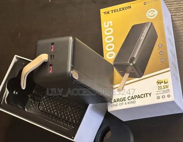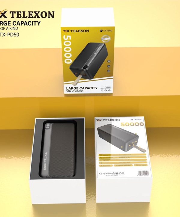 The Tx telexon 50,000mAh power bank is a high-capacity portable charger designed for extended use, capable of charging phones and
